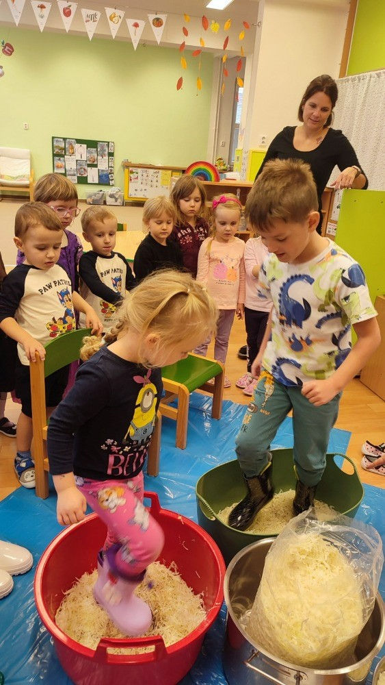 S dětmi také zavařujeme a letos jsme společně šlapali zelí. Snažíme se dodržovat i tradice například o Vánocích pečeme vánočky v krojích. Pořídili jsme sušičku na ovoce, ve které si děti připravují křížaly a suší bylinky. Lisovali jsme také mošt z jablek, které nám donesli rodiče.