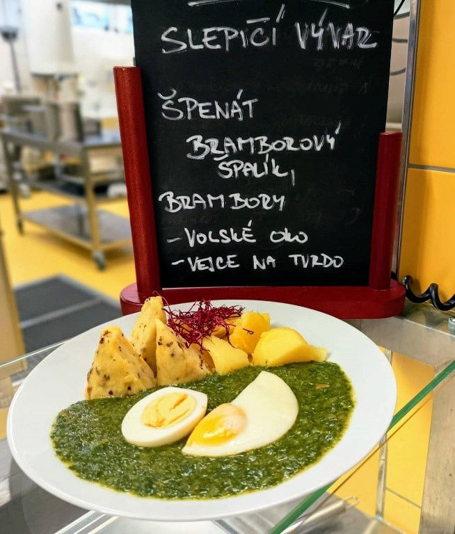 Některé méně obvyklé suroviny zařazuje ŠJ velmi pozvolna příkladem může být tento pokrm: Špenát, volské oko, vařené vejce, bramborové špalíčky s červenou quinoou, vařený brambor.